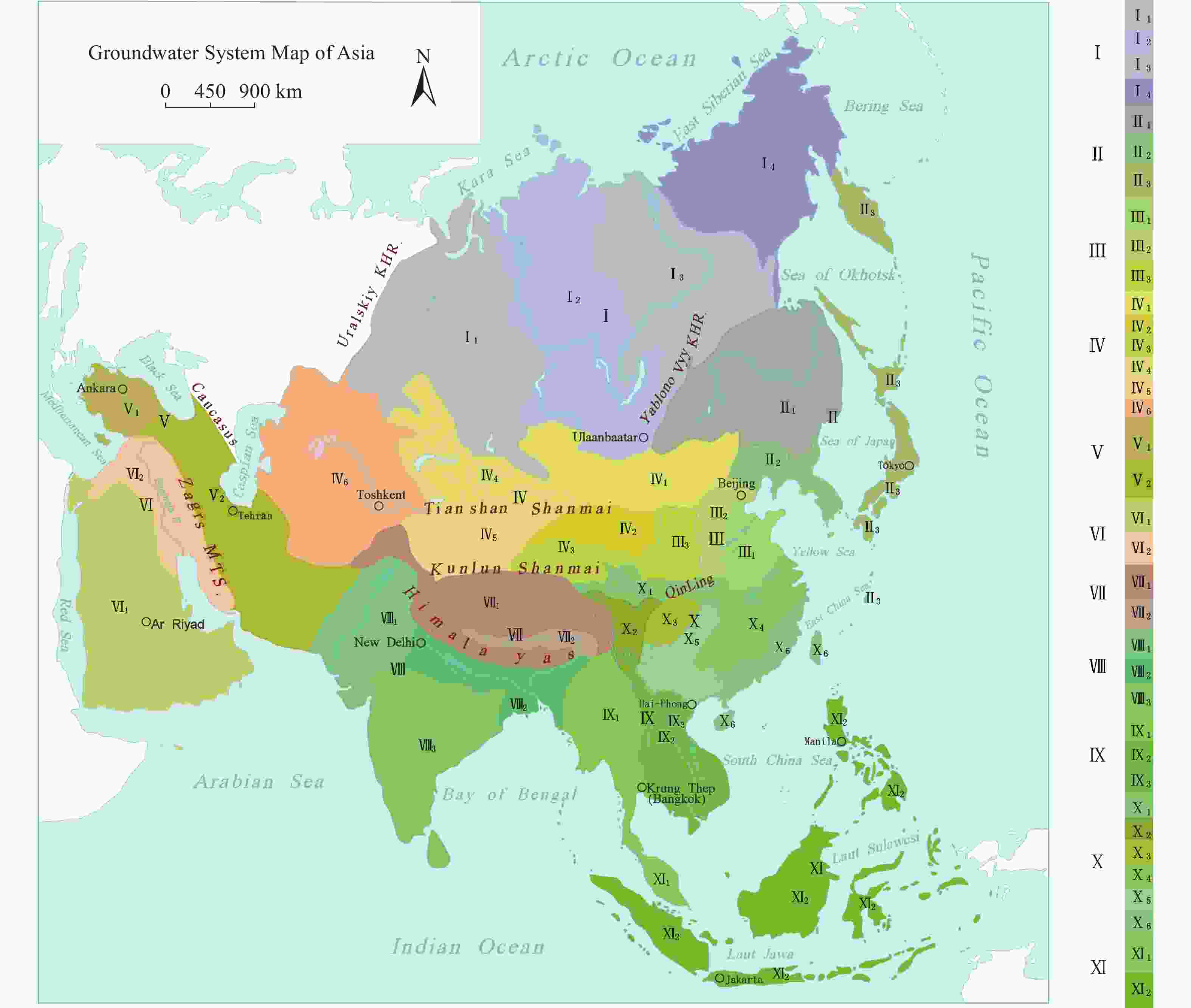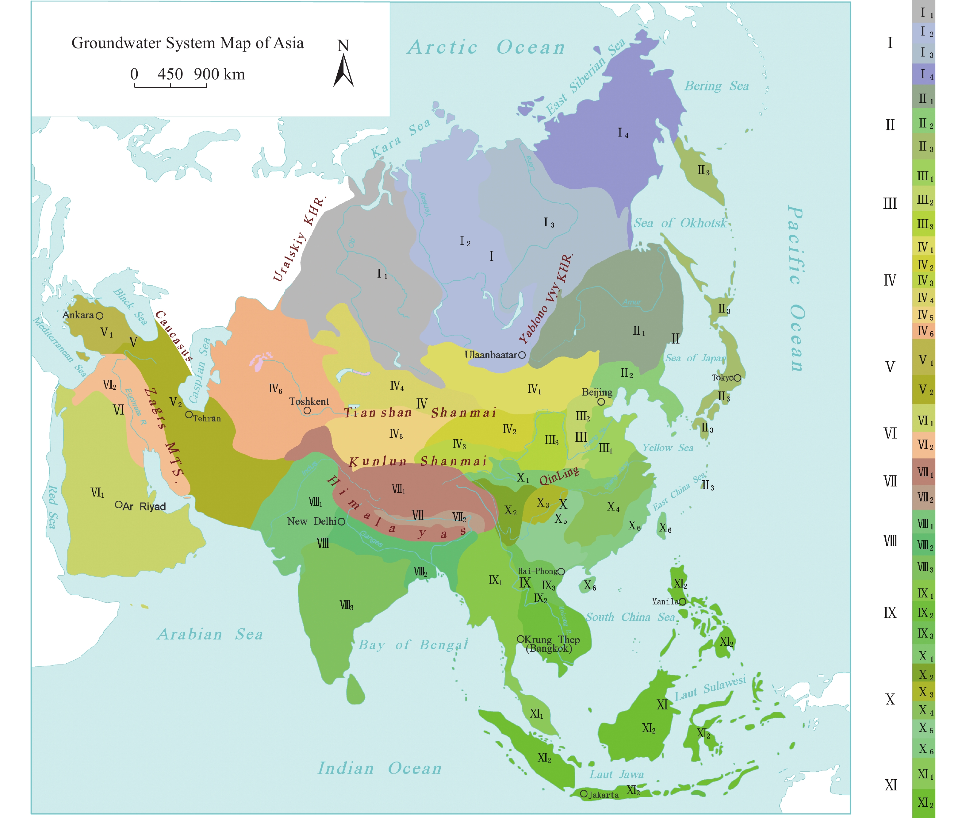 Notes: Ⅰ1—Groundwater system in Ob River Basin of west Siberia Plain;Ⅰ2—Groundwater system in Yenisei River Basin of central Siberia Plateau;Ⅰ3—Groundwater system in Lena river Basin of central Siberia Plateau;Ⅰ4—Groundwater system in Kolyma River Basin of eastern Siberia;Ⅱ1—Groundwater system in Heilongjiang River (Amur River);Ⅱ2—Groundwater system in Liaohe River Plain-Korea Peninsula;Ⅱ3—Groundwater system in islands of northeastern Asia;Ⅲ1—Groundwater system in Huang-Huai-Hai Plain-Shandong Peninsula;Ⅲ2—Groundwater system in Shanxi-Hebei intermontane basin;Ⅲ3—Groundwater system in Ordos-Loess Plateau;Ⅳ1—Groundwater system in Mongolia Plateau;Ⅳ2—Groundwater system in Hexi Corridor;Ⅳ3—Groundwater system in Ili River Basin-Junggar Basin;Ⅳ4—Groundwater system in Tarim Basin;Ⅳ5—Groundwater system in Qaidam Basin;Ⅳ6—Groundwater system in Kazakhstan hilly area-Tulan Plain;Ⅴ1—Groundwater system in Asia Minor Peninsula(Anatolia Plateau);Ⅴ2—Groundwater system in Iran Plateau;Ⅵ1—Groundwater system in Mesopotamian plain;Ⅵ2—Groundwater system in Arabian Peninsula;Ⅶ1—Groundwater system in Kashmir- Himalaya-Qiangtang Plateau;Ⅶ2—Groundwater system in southern Tibet valley;Ⅷ1—Groundwater system in India River Plain;Ⅷ2—Groundwater system in Ganges River Plain;Ⅷ3—Groundwater system in India Peninsula;Ⅸ1—Groundwater system in upland and plain of Lancangjiang River- Salween River Basin;Ⅸ2—Groundwater system in upland and plain of Lancangjiang River-Meikong River Basins;Ⅸ3—Groundwater system in upland and plain of Red River Basin;Ⅹ1—Groundwater system in Qinling-Dabieshan Mountains;Ⅹ2—Groundwater system in terraced terrain of west Sichuan Plateau;Ⅹ3—Groundwater system in Sichuan Basin;Ⅹ4—Groundwater system in hilly area of middle and lower reaches of Yangtze River;Ⅹ5—Groundwater system in karst upland of South China;Ⅹ6—Groundwater system in coastal hilly area and islands of South China;Ⅺ1—Groundwater system in Malay peninsula;Ⅺ2—Groundwater system in islands of southeast Asia.