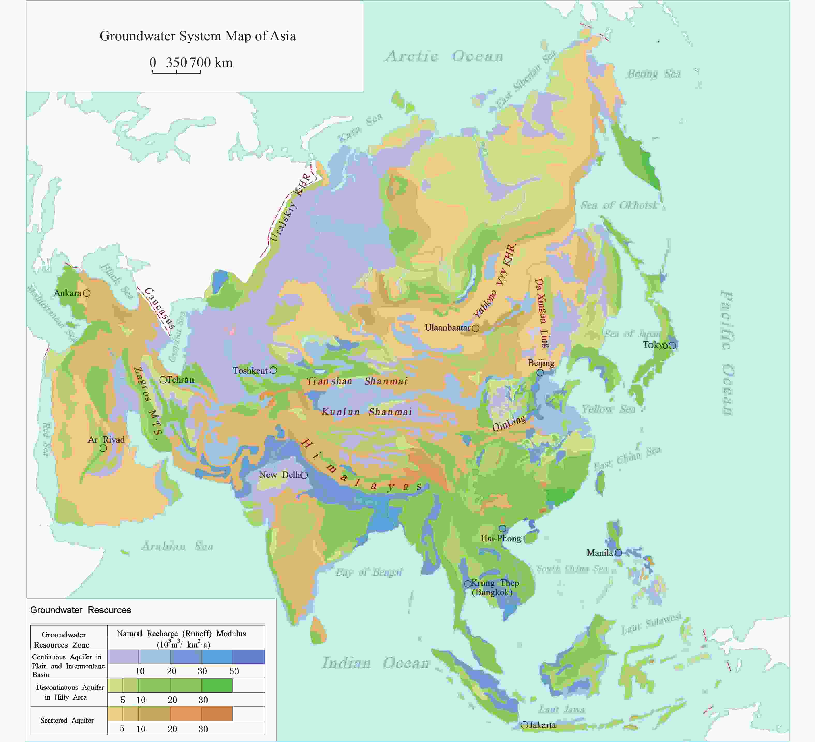 Code Primary groundwater system Natural recharge resources Exploitable resources I North Asian Plateau and Highland Cold Temperate Groundwater System 1,007.45 705.21 II Northeast Asia Mountainous and Plain Temperate Semi-Humid Groundwater System 323.42 226.39 III North China Plain, Mountainous, and Loess Plateau Temperate Semi-Arid Groundwater System 165.86 116.1 IV Inland Basin and Hill Mountain Temperate Arid Groundwater System 845.67 591.97 V Iranian Plateau - Anatolian Peninsula Subtropical Arid, Semi-Humid Groundwater System 157.51 110.26 VI Arabian Peninsula - Mesopotamian Plain Tropical Arid Groundwater System 213.6 149.52 VII Qinghai-Tibet Plateau Cold Highland Groundwater System 490.96 343.67 VIII South Asia Two Rivers Plain - Deccan Plateau Tropical Wet-Semi-Wet Groundwater System 587.8 411.46 IX Indochina Peninsula Mountainous Hilly Tropical Wet Groundwater System 201.66 141.16 X South China Mountainous Hilly and Plain Subtropical Wet Groundwater System 309.9 216.93 XI Southeast Asia Island Group Equatorial Humid Groundwater System 357.45 250.21 -